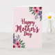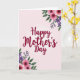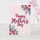 Designed with a soft, romantic touch, this card features the words “Happy Mother’s Day” centered in a deep burgundy font that looks like flowing pen strokes. The lettering sits in the middle with plenty of breathing room, giving it a calm, affectionate focus ❤️. In the top-right corner, a cluster of flowers leans inward as if offering a gentle greeting, with bright fuchsia and soft pink blooms surrounded by smaller deep-purple blossoms. A matching floral cluster anchors the bottom-left corner, creating a sweet balance that feels like a caring embrace between loved ones. Fresh green leaves weave through both corners, adding a natural frame without crowding the message. The background fades from a pale pink glow near the center to a deeper rose tone toward the edges, like a soft halo around the text 🌼. The flowers have a light, painted texture, and the top-right and bottom-left bouquets mirror each other with layered petals and leafy accents.