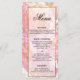 A very pretty pink floral wedding reception menu which can be easily changed to include your own details. The design consists of a lovely watercolor pattern of pink roses around the edges and on the back. All of the text details on the front are enclosed in a box with a gold frame around it.