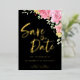 Modern foil watercolor pink roses corner on black background with golden handwritten font "Save the Date" invitation. This design features a large calligraphy style font which you can change its color. You can also customize all details and colors on this Save the Date design.