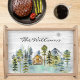 Introducing our Watercolor Rustic Foggy Forest Mountain Cabin Serving Tray. featuring a watercolor cabin nestled in a foggy green pine forest. Great for rental vacation cabin, lodge, lake house, and cottage.