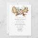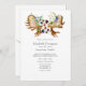Trendy wild woodland wedding invitation featuring hand painted watercolor bouquets with forest berries - blueberry, blackberries and sprigs, pine cones, ferns, feathers and moose horns.