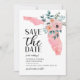 Elegant script Florida destination wedding save the date with a pink floral state illustration.