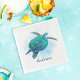 These napkins are perfect for pool parties, beach house entertaining, weddings, and any other coastal event, featuring a cute aqua blue sea turtle swimming on a splash of watercolor ocean wave.
