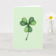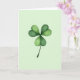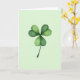 This card features a three-leaf clover centered on a pale mint-green background, painted in soft watercolor washes that feel calm and inviting ☘️. Each heart-shaped leaflet opens from the middle like three small hands meeting, giving the image a gentle, friendly closeness. The color shifts from light jade along the edges to deeper emerald and forest green where the leaves join, as if the clover is leaning in toward itself. Diffused light and watery blending soften the contours, keeping the shapes smooth rather than sharply outlined. You can see slight pigment bleed and fine speckling in the paint, adding texture that suggests real paper and careful brushwork. Near the top, a short St. Patrick’s Day greeting appears in a medium green tone that matches the leaf shadows, with plenty of breathing room around it 💚. The layout stays simple and open, with the clover taking the spotlight and the background remaining airy and quiet. The final look is a centered shamrock with three balanced leaflets, subtle watercolor granulation, and a mint field fading evenly to the edges.