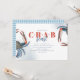 This design features a simple watercolor blue crab feast, with a nautical crab boil bake party, a coastal living seaside ocean sea, great for seafood dinner party event invitation, a stylish trendy typography font text, a modern calligraphy script typography, with a Maryland New England Maine coast style ,whimsical crab legs boiled baked, an elegant stylish fun water ocean, with a crustacean red blue animal marine life with a blue gingham summer tablecloth pattern