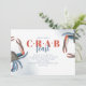 This design features a simple watercolor blue crab feast, with a nautical crab boil bake party, a coastal living seaside ocean sea, great for seafood dinner party event invitation, a stylish trendy typography font text, a modern calligraphy script typography, with a Maryland New England Maine coast style ,whimsical crab legs boiled baked, an elegant stylish fun water ocean, with a crustacean red blue animal marine