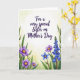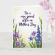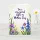 This greeting card features a watercolor-style floral border that wraps around a central message, giving the layout a gentle, affectionate feel ❤️. Near the top center, the main line of text sits in a deep purple, with the wording about a special sister for Mother’s Day standing out clearly against the light background. The lettering has a flowing, graceful look, like a soft note written with care, and it leaves airy space around it so the flowers can “lean in” without crowding the words. Along the left edge, open blooms in lavender and violet show warm yellow-orange centers, paired with slim green leaves that curl inward like a friendly hug. On the right, a vertical cluster of bell-shaped blossoms in indigo-blue rises upward, adding a calm, supportive counterbalance to the left side. A single bright blue flower with a golden center sits nearby, like a small, sweet accent in the bouquet 🌼. Behind everything, the background fades in a light wash of pale yellow and soft green, deepening slightly toward the bottom like sunlight filtering through a spring garden. The flowers frame the purple text with lavender, violet, indigo-blue, and bright blue petals, plus green leaves and golden centers against the pale yellow-green wash.