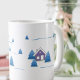 A Coffee Mug with a snowy landscape in a watercolor painting style with some fir trees and a purple house. It could be a great gift for Christmas!