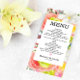 Elegant wedding menu has intensive spring floral background. Watercolor flowers are orange, pink and purple. This wedding menu card is part of "Spring Floral Vivacity Collection A102" where you can find variety of coordinating wedding products.