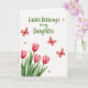 This greeting card features a bright white background with a sweeping green message centered near the top in flowing lettering. Below and to the left, four soft pink flower buds rise on long green stems and leaves, painted with a gentle watercolor look that feels like early spring 🌷. Three small red winged insects drift across the open space, their fine line details adding a sense of motion, like they’re circling the blooms. Tiny red hearts are sprinkled nearby, echoing the insects’ color and suggesting a sweet, affectionate exchange in the scene. The layout leaves plenty of airy space, making the green text stand out while the flowers anchor the lower corner. The colors stay simple—green, pink, and red—so the romantic hints come through in the way the hearts cluster close to the fluttering insects 🐇. Several bright red hearts sit around the insects, with the pink buds grouped together at the bottom left.
