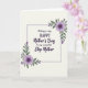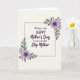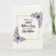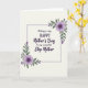 This card features a centered message that reads “Wishing a very HAPPY Mother’s Day to my wonderful Step Mother,” arranged in mixed lettering styles for contrast and emphasis. “HAPPY” stands out in larger uppercase letters, while the rest of the linework feels softer and more flowing, like a gentle note passed between close family ❤️. The text sits inside a thin rectangular border drawn in a medium violet tone, giving the layout a calm, framed look. In the top right corner, a cluster of watercolor-style flowers leans inward as if lovingly reaching toward the message. A matching floral cluster appears in the bottom left, creating a diagonal balance that feels like a quiet exchange of affection 🌼. The blossoms are layered in pale lavender and deeper purple shades, with softly shaded centers that add depth without looking heavy. Around them, muted green and grey-green leaves curl outward with a few tiny buds scattered between stems. The background is a creamy off-white with a subtle paper-like texture, and the flowers slightly spill beyond the border at the corners.