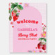 This berry first birthday welcome sign design features a pink arch with watercolor strawberries and florals on the sides. The text reads 'Welcome to 'Name's' Berry First Birthday Party', you can change the guest of honor's name and the event name. Behind the design is a pattern of pink plaid. On the back of the design is a watercolor strawberries and floral pattern. See the whole matching collection.