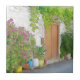 Watercolor street view with colorful flowers, door and stone wall in Cyprus