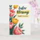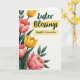 Designed with an off-white background, this card features a lush border of spring flowers and leafy stems curling along the left side and across the bottom 🌷. Sunny yellow and soft coral-pink tulips sit among deep green leaves, their gently shaded petals giving the scene a tender, just-picked look. The open space to the right feels like a quiet pause where the bouquet seems to lean in, as if sharing a close moment with the reader 🐰. In the upper-right area, the words “Easter Blessings” appear in dark green lettering, set over a wide, paint-like yellow brush stroke that makes the message stand out. Just beneath it, “Daughter & Son-in-law” is placed on a second yellow stroke, aligned with the first for a balanced layout. Soft light and subtle color shifts across the petals add depth, while the background stays lightly textured and uncluttered. At the bottom edge, a fully opened coral bloom shows tiny golden stamens at its center, framed by layered petals and dark green stems.