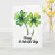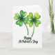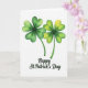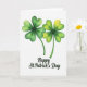 This design shows two four-leaf clovers painted in layered greens, their heart-shaped leaves shifting from deep emerald near the base to lighter chartreuse at the edges 💚. Each clover has a slim, curving stem, and they tilt slightly toward each other as if sharing a private moment. The white background stays open and airy, making the green tones stand out without any extra scenery. Soft, feathered edges and gentle texture inside the leaves give them a tender, brushed look, like fresh spring growth. The clovers sit near the top half of the card, leaving space below for the message. Centered underneath, the text reads “Happy St. Patrick’s Day” in a dark charcoal-green, flowing calligraphy style ☘️. The lettering is placed low enough to balance the artwork while keeping the clovers as the main focus, and the final view is two green clovers leaning inward above the dark green greeting on a plain white field.