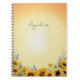 Brighten your day with this beautiful Watercolor Sunflower Notebook, designed to inspire creativity and joy. Featuring a golden textured canvas background, this elegant journal brings a touch of rustic charm and sophistication to your stationery collection. A delicate floral edge of watercolor sunflowers and lush greenery gracefully frames the bottom of the cover, offering a warm, nature-inspired aesthetic. The golden backdrop enhances the vibrant sunflower illustration, creating a stunning contrast that catches the eye. Personalize it with your custom name elegantly displayed across the front, making it uniquely yours or a thoughtful gift for someone special. Whether you're making notes, planning, or sketching, this personalized sunflower notebook is perfect for everyday use, school, or as a stylish office accessory. Ideal for sunflower lovers, floral stationery fans, and anyone who appreciates elegant, custom notebooks. Add a touch of sunshine to your desk or bag with this lovely floral notebook!