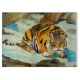 Watercolor painting of a regal tiger in winter pausing for a drink from a peddle of melting snow. Spring is just around the corner.