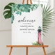 This wedding reception welcome sign includes the couple's names in elegant script typography beneath a lush top border of tropical palm trees and botanical greenery. Ideal for rehearsal dinners or ceremonies by the coast, it brings together botanical charm and oceanfront sophistication.