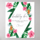 Tropical Palms Watercolor Bridal shower invitation. Design features an watercolor elegant bouquet of classic beach watercolor greenery and flowers, including blush pink hibiscus, orange and blue bird of paradise, green greenery and dark green palm leaf.