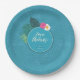 Colorful paper plates featuring a round teal frame bordered by watercolor hibiscus blooms and palm leaves. The repeating, palm leaf background pattern is optional and can be changed if preferred. Script text of 'Love and Thanks' is also optional. Add your names and wedding date using the provided template. This tropical design is perfect for summer, beach and tropical weddings, birthdays and other special events. Search ID577 to see matching products.