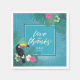Colorful wedding paper napkin design featuring a square teal frame with corner borders of a bold toucan sitting among watercolor hibiscus blooms and palm leaves. The repeating, palm leaf background pattern is optional and can be changed to white if preferred. These tropical napkins are perfect for summer, beach and tropical weddings, birthdays and other events. Search ID577 to see matching products.