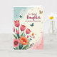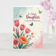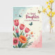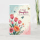 This design shows a gentle pastel scene where a lush floral cluster fills the lower and left edges, with pink tulips rising beside coral and peach blossoms that show tiny yellow centers, all tucked into leafy green stems. The background fades from soft sky-blue at the upper left into a creamy light area near the middle, then drifts into a rosy blush toward the lower right, giving the layout a calm, affectionate glow ❤️. Small orange and red dots are sprinkled across the open space like light confetti, adding a friendly, celebratory touch without overpowering the flowers. Near the top, two butterflies float as if circling each other—one in teal and the other in warm brown—adding a sweet, companionable feel 🌼. Centered in the open area, the main line of text reads “To a Special Daughter” in a darker, prominent lettering style. Just below it, “Loving wishes on Mother’s Day” appears in a smaller, simpler font, also in a dark tone for easy reading. The flowers have softly blended edges like watercolor washes, with the tulips leaning slightly upward and the teal butterfly angled toward the words near the top.