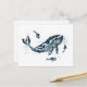 a decorative watercolor painting of a whale and some smaller fish in blue colors on a postcard
