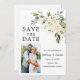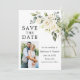 Watercolor Ivory White Floral Greenery Wedding Engagement Announcement Save The Date Card includes ivory cream white roses and botanical greenery. Couple Photo.