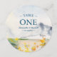 Elegant watercolor botanical table number card in a unique round format frames your details with a border watercolor mountains and florals in pale, cool shades of dusty blue, grays, yellows and greens. The font is set in modern sans serif and script typography. Perfect for spring, summer, fall autumn, rustic or garden theme weddings. To see more designs like this visit VG Invites at www.zazzle.com/vginvites