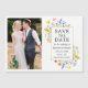 Modern Watercolor Wildflower Wedding Wedding Engagement Announcement Save The Date Magnet Card includes delicate yellow, pink, peach, dusty blue, sage green, purple, red and orange wild flowers, poppies, eucalyptus leaves and other beautiful botanical greenery on a gold frame. Couple Photo.