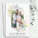 Modern Watercolor Wildflower Wedding Wedding Engagement Announcement Save The Date Card includes delicate yellow, pink, peach, dusty blue, sage green, purple, red and orange wild flowers, poppies, eucalyptus leaves and other beautiful botanical greenery on a gold frame. Couple Photo.