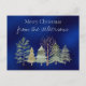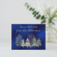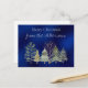 This simple and elegant, yet festive Christmas holiday postcard features a cozy watercolor design. An image of a winter forest is placed across the bottom, with various trees sprinkled with snow. A sample family name and Christmas greeting are printed at the top. You can personalize the postcard to include your own custom name or text. The background on the front features a dark blue textured pattern, to resemble a winter night.