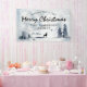 Merry Christmas banner featuring a watercolor woodland scene with snowy mountains and forest trees, cute little silhouette wildlife animals and a template that is easy to personalize with your family name.