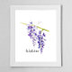 Pretty botanical style watercolor painting of hanging purple wisteria in full bloom, with text on white background