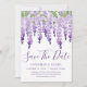 Watercolor Wisteria Save the Date features elegant watercolor wisteria flowers in soft lavender and purple with green leaves on a white background with your Save The Date information below. Personalize by editing the text in the text boxes. Designed for you by Evco Studio www.zazzle.com/store/evcostudio