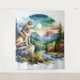 This is a tapestry that has a watercolor rendering of a wolf in nature.