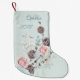 Christmas Stocking | Add Name and Date - Whimsical White Deer and a winter floral botanical spray of pine cones, pink roses, eucalyptus leaves and winter branches - a winter botanical floral spray on the back . on a very light mint green background. This is part of the Watercolor Woodland Deer Collection by WhimsicalArtwork™
