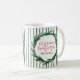 Watercolor wreath and stripe christmas holiday gift mug. Hand lettered text. A modern take on tradition red and green.
