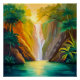 The AI created interpretation from my description representing the sun setting behind a waterfall as its light colors the surrounding landscape while trees light the edges of the river.