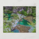 Painting of view from above of waterfalls cascade and wooden path with tourists in Plitvice national park, Croatia. Mountain forest waterfall landscape.