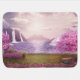 A blanket with a scenic image of a peaceful purple lake. Surrounded by lush cherry trees and waterfalls.