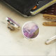 Lapel pin with a scenic image of a peaceful purple lake. Surrounded by lush cherry trees and waterfalls.