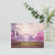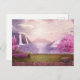 A postcard with a scenic image of a peaceful purple lake. Surrounded by lush cherry trees and waterfalls.