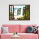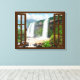 Waterfall Trompe L'oeil Picture with fake window view. Photo optical illusion special effect, with open window and beautiful tropical sea view.