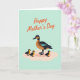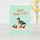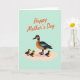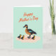 This card features a gentle illustration of an adult waterfowl standing protectively over three tiny, fluffy young, their close huddle suggesting a tender, affectionate bond ❤️. The adult bird is colored in warm chestnut and deep charcoal tones, giving it a calm, steady presence. A few turquoise-blue wing feathers add a bright accent, like a soft spark of attention in an otherwise earthy palette. The three little ones have sunny yellow heads and beaks, and they nestle right against the adult as if sharing quiet closeness. The group sits on a rounded blush-pink shape that feels like a soft patch of ground beneath them. Above the scene, the words “Happy Mother’s Day” appear near the top in coral orange lettering, standing out clearly against the background 🌼. Behind everything is a pale mint-green field, keeping the setting airy and simple, with the blush-pink base centered below the birds.