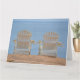 Two waterfront Adirondack chairs evoke a relaxing scene.