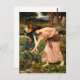 John William Waterhouse Gather Ye Rosebuds Postcard. Oil painting on canvas from 1909. One of Waterhouse’s most beloved paintings, Gather Ye Rosebuds While Ye May features two barefoot young women gathering pink, white and red roses from a verdant field. The brunette wears a pink dress, the redhead a dark blue dress. Both bend down towards a bush of miniature white roses while two other girls stand in the background beside a pretty stream. A great gift for fans of J.W. Waterhouse, the Pre-Raphaelites, English Romantic painting, rose painting, and floral art.