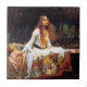 John William Waterhouse The Lady of Shalott tile. Oil painting on canvas from 1888. The Lady of Shalott is a beautiful Pre-Raphaelite painting of a scene from Alfred Lord Tennyson’s poem of the same name. The painting depicts the doomed Lady of Shalott sailing towards Camelot in a small boat draped with a beautiful red tapestry she wove while falling in love with Lancelot. In the boat sit three candles and a crucifix from which the girl looks away. The lady herself is clothed in a flowing light blue medieval dress embroidered with gold. Her hair is light auburn and she holds the chain of the boat as it presses away from the dock into the reeds and lily pads beyond. A great gift for fans of John William Waterhouse, the Pre-Raphaelites, Romantic English painting, and Arthurian Legend.