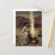 John William Waterhouse the Magic Circle postcard. Oil painting on canvas from 1886. The Pre-Raphaelite painter John Waterhouse regularly drew from literary and mythological themes. The Magic Circle continues the artist’s fascination with the supernatural, depicting a sorceress with dark hair drawing a magic circle in the dirt with a wand. Wearing a blue dress decorated with Persian figures, she stands beside a cauldron smoking above the orange and red embers of a glowing fire. Black ravens stand nearby watching the ritual unfold. A great gift for fans of J.W. Waterhouse, the Pre-Raphaelites, magic, sorcery, and English Romantic painting.