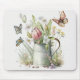 Retro watering can with tulips and butterflies in a watercolor effect.